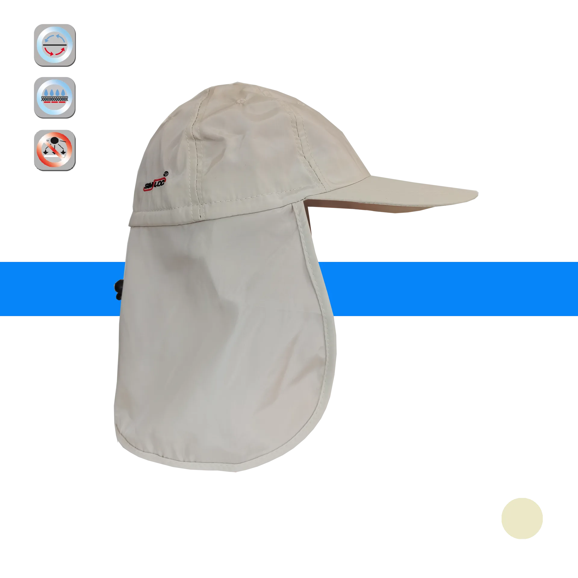 Dieser Sonnenschutz-Hut aus der BLUE_LINE ist aktiv kühlend. Durch eine zusätzliches Pad mit einer Membran am Kopfteil kann Wasser im Material gespeichert werden und kühlt über Stunden den Kopf. Dazu bietet er einen optimalen Tragekomfort und bietet einen hohen Schutz vor Sonneneinstrahlung 50+. Der Hut ist nach den strengen Kriterien der Norm DIN EN 13758-1 : 2007-03 zertifiziert. Das Material des Hutes ist sehr leicht und lässt zudem Feuchtigkeit von außen abperlen. Durch 2 Bänder kann man den Hut unter dem Hals fixieren, sodass er guten Halt hat und den Kopf vor Sonnenstrahlen schützt. Der Hut ist durch ein Zugband größenverstellbar und der Nackenschutz ist durch Knöpfe abtrennbar.