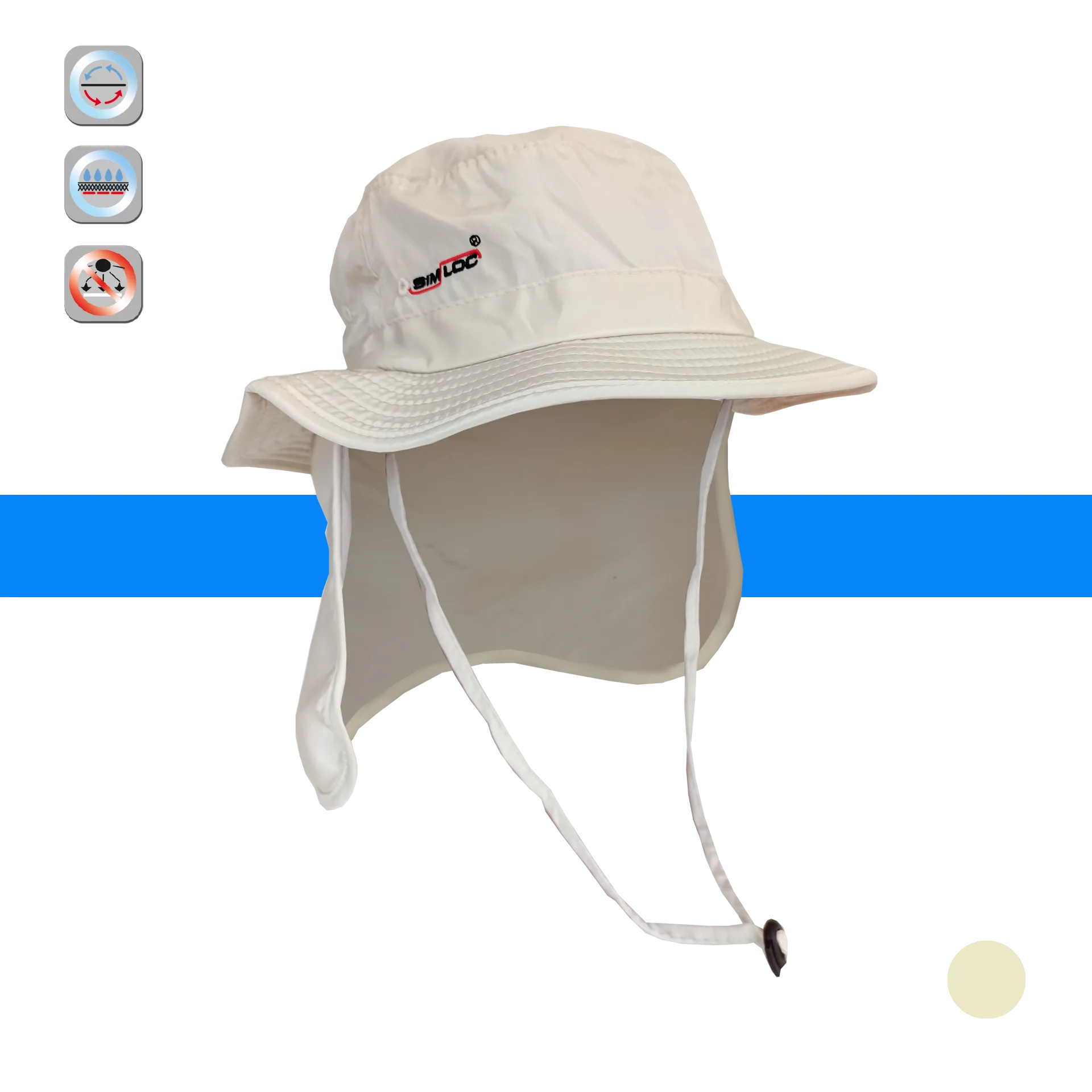 Dieser Sonnenschutz-Hut aus der BLUE_LINE ist aktiv kühlend. Durch eine zusätzliches Pad mit einer Membran am Kopfteil kann Wasser im Material gespeichert werden und kühlt über Stunden den Kopf. Dazu bietet er einen optimalen Tragekomfort und bietet einen hohen Schutz vor Sonneneinstrahlung 50+. Der Hut ist nach den strengen Kriterien der Norm DIN EN 13758-1 : 2007-03 zertifiziert. Das Material des Hutes ist sehr leicht und lässt zudem Feuchtigkeit von außen abperlen. Durch 2 Bänder kann man den Hut unter dem Hals fixieren, sodass er guten Halt hat und den Kopf vor Sonnenstrahlen schützt. Der Hut ist durch ein Zugband größenverstellbar und der Nackenschutz ist durch Knöpfe abtrennbar.
